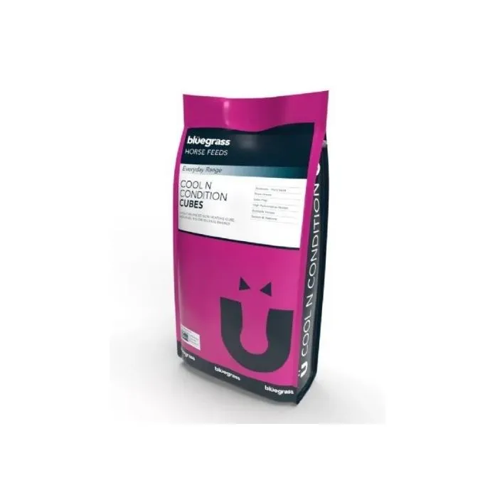 Bluegrass Cool n’ Condition cubes have been designed for horses requiring extra condition and weight gain, includes the high calorie, stabilised rice bran Equi Jewel. The oat free, high fat content provides slow-release energy sources.