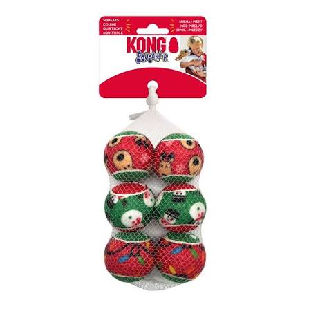 Bring some jolly excitement to playtime with the KONG® Holiday SqueakAir Balls! This festive 6-pack combines two doggy favourites — a tennis ball and a squeaker — into one irresistible fetch toy. Made with non-abrasive KONG Tennis material that’s gentler on teeth and gums than standard tennis felt, these balls are designed for safe, interactive fun. The squeaker keeps dogs engaged, while the dynamic bounce encourages energetic play. With bright holiday colours and cheerful designs, they’re perfect for festive fetch sessions indoors or out!