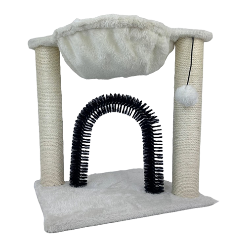 A 3-in-1 cat scratching post, with a hanging bed for kittens to sleep.