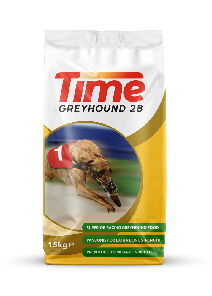 Time Greyhound 28 is a complete food for racing greyhounds. It can also be fed as part of a home-mix of meat and other ingredients.